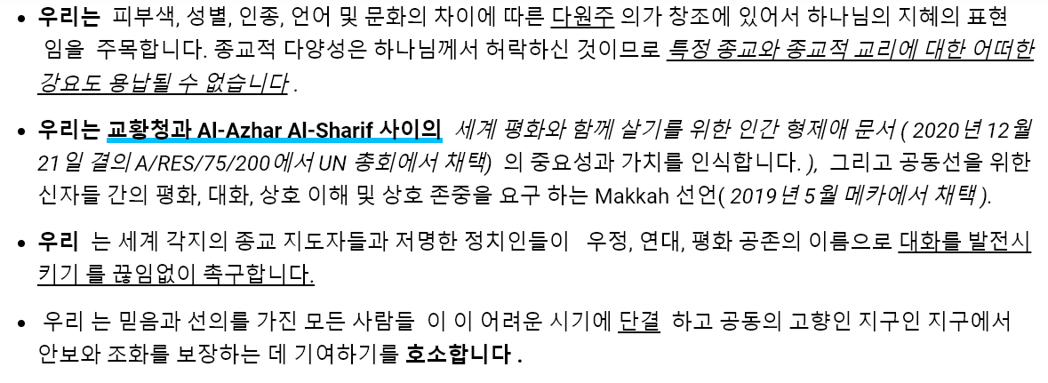내용은 이슬람측 제의를 받아들이는 내용이다. 두 종교가 아브라함의 후손으로써 동일한 유일신 하나님에 근원을 두며, 가장 큰 계명인 1) 하나님 사랑과 2) 이웃 사랑을 양쪽이 코란경이나 복음서에서 모두 강조하고 있다고 하였다. 이러한 공통 표어로서 서로 접근하며 기독교와 이슬람 세계의 평화와 조화를 이루어나갈 수 있다고 하였다.
