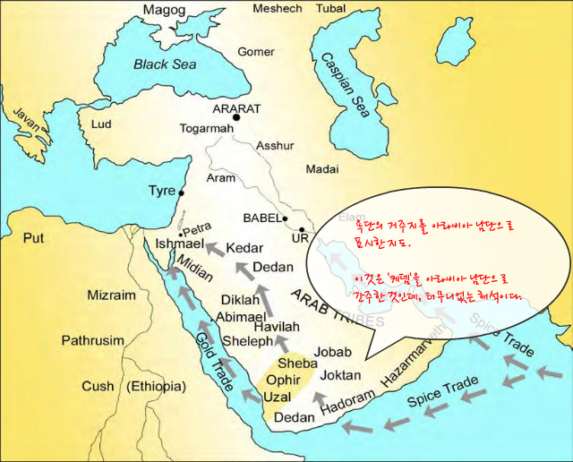 현재 아랍민족은 이스마엘의 후손이 퍼져있고, 롯의 후손 모압과 암몬족속, 그 밖에 셈의 아들인 엘람족, 아수르족, 룻족, 아람족등이 섞여 있습니다. 그러므로 욕단이 아라비아로 가서 아랍부족의 선조가 되었다고 하는 사람들은 ‘메사’와 ‘스발’의 위치를 결코 찾을 수 없을 것입니다. 이들은 메 사와 스발의 위치를 찾을 수 없다고 말합니다. 아라비아 주변에는 그런 곳이 과거에도 없었고 지 금도 없습니다. 그리고 아라비아 지역에는 창세기 10:30에서 말하는 동쪽의 높은 산맥도 없습니 다. 욕단의 후손이 어디에 누군지를 찾는 데 결정적인 단서를 제공하는 것은 욕단계 선민이 동양 에 거주하고 있다고 말합니다. 아라비아는 본문이 말하는 동방이 아닙니다. 아라비아는 남방이기 때문입니다. 세계지도를 보면 아라비아 반도는 아프리카의 우측에 위치했으며, 북쪽은 이집트, 중 부는 수단과 남쪽은 이디오피아와 위도가 겹칩니다.