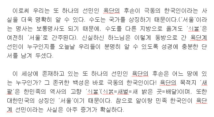 그러나 겉 사람 보다 속 사람이 더 중요 하듯이 겉으로 드러난 선민보다 속으로 감추인 선민이 더 소중합 니다. 감춘다는 것은 중요하다는 뜻입니다. 땅 속에 감추인 보화 이야기를 생각하실 것입니다. 욕 단의 후손들이 바로 이런 존재들인 것입니다. ‘욕단의 후손’도 하나님의 특별하신 뜻이 있어 하나 님은 그들도 세상 어딘 가에 한 나라를 이루게 하시고 은밀히 감추어 놓으신 것입니다.